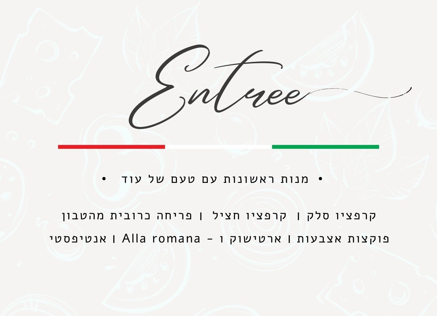 כל מנה בתפריט שלנו נבחרת בקפידה ובדגש על כל הרטבים של הסלטים הפסטות והקינוחים הנעשים בהכנה אישית ע"י השף משלב הבסיס ועד ההכנה הסופית ,